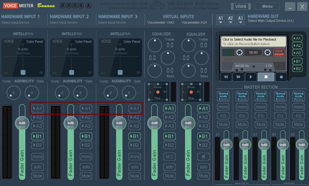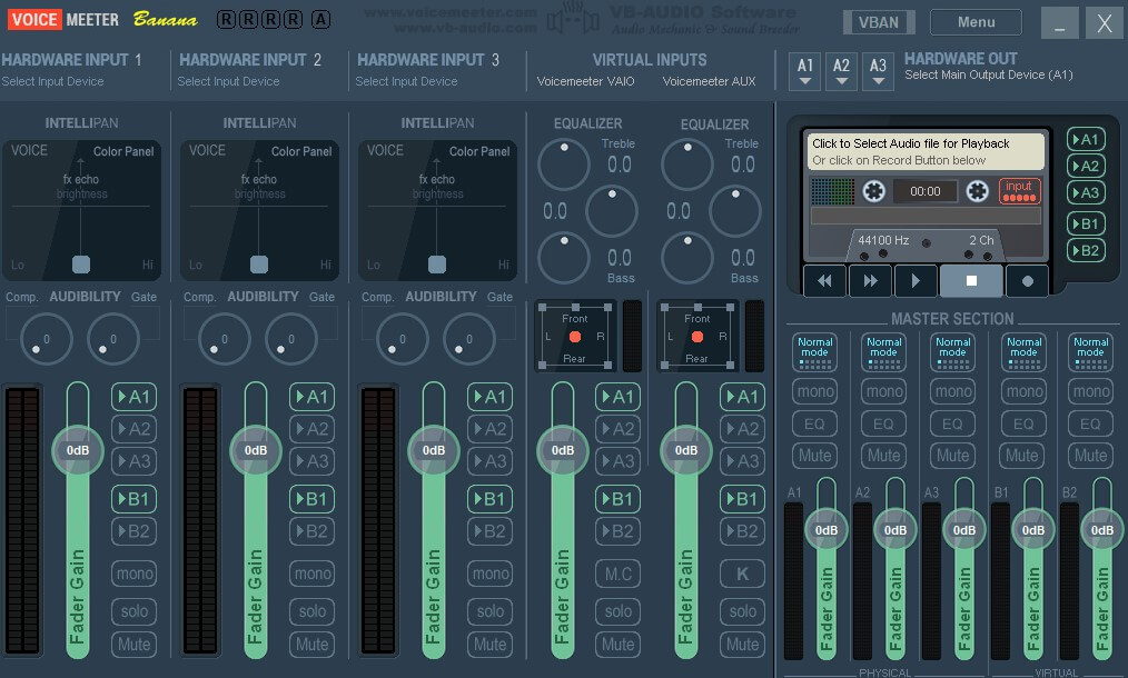 A VoiceMeeter Banana 2 lejátszó és 2 rögzítő eszközzel rendelkezik:
