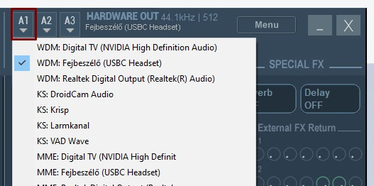 A Hardware Output panelban van lehetőségünk kiválasztani a kimeneti hangeszközeinket, példáil headset-et, hangszórót.