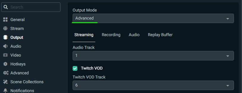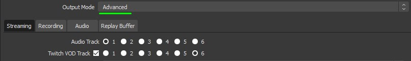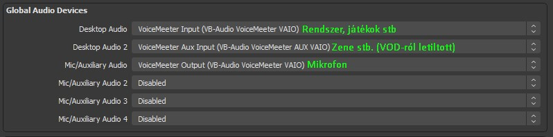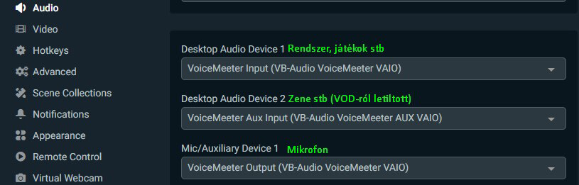 Az OBS-en belül több hangsáv áll rendelkezésünkre, ezek közül tudunk egyet fenntartani a Twitch VOD számára.