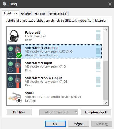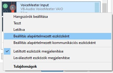 Lejátszás fül VoiceMeeter Input > Jobb egérgomb Beállítás alapértelmezettként
