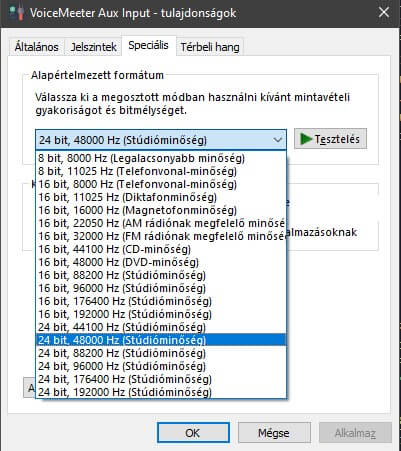 VoiceMeeter Input > Jobb egérgomb Tulajdonságok Speciális Alapértelmezett formátum pl. 24 bit, 48000 Hz (Stúdióminőség)